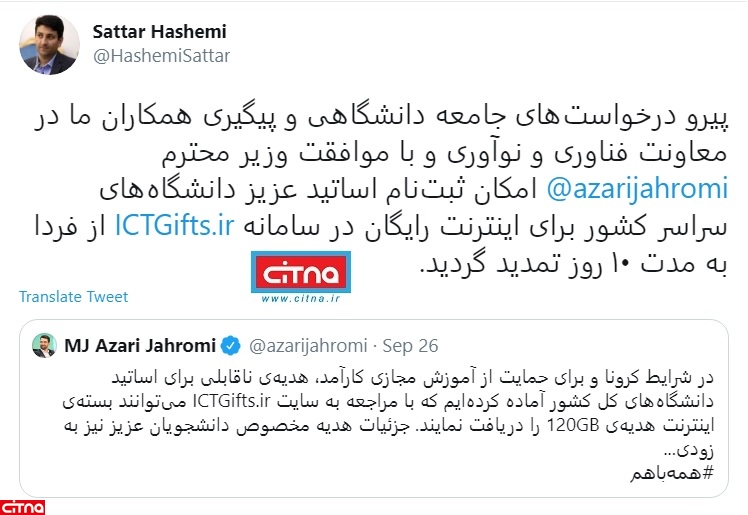 پیرو درخواستهای جامعه دانشگاهی و پیگیری همکاران ما در معاونت فناوری و نوآوری و با موافقت وزیر محترم امکان ثبتنام اساتید عزیز دانشگاههای سراسر کشور برای اینترنت رایگان در سامانه http://ICTGifts.ir از فردا به مدت ۱۰ روز تمدید گردید.