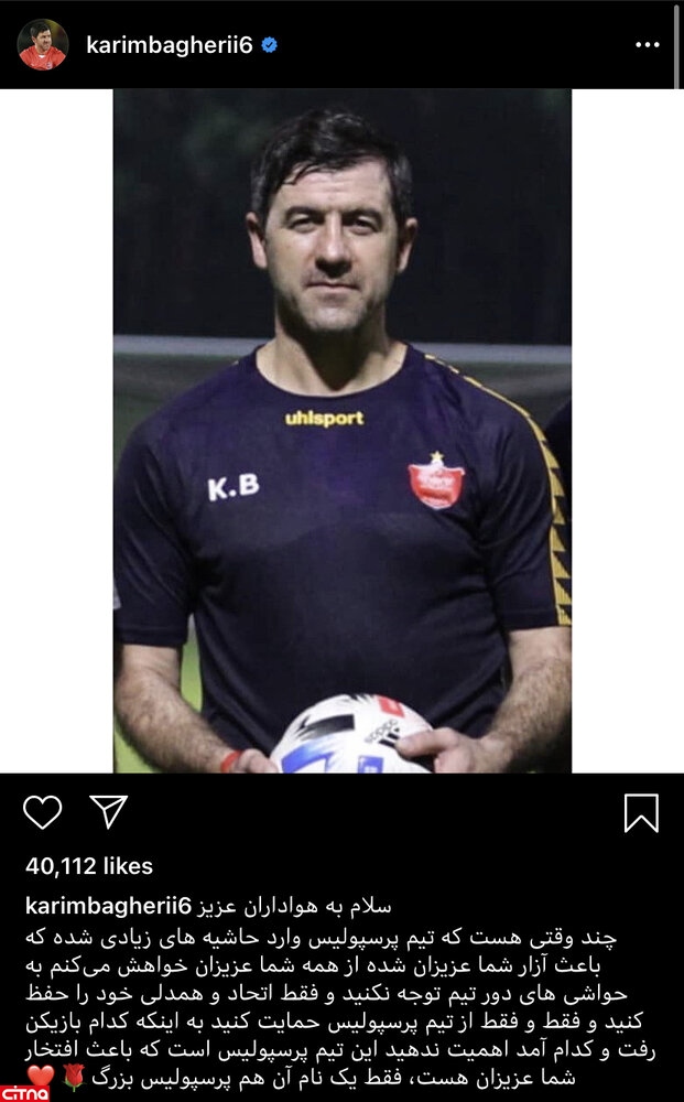 کریم باقری با انتشار پستی در صفحه اینستاگرامش از هواداران این تیم خواست تا اتحاد خودشان را حفظ کنند.