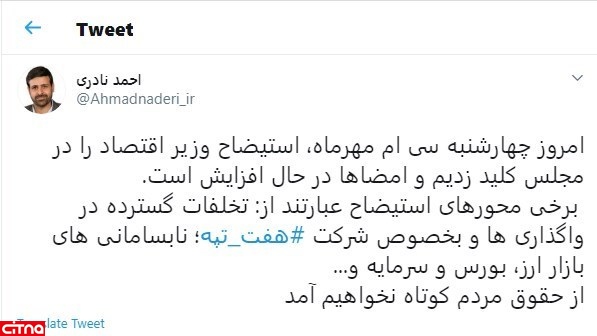 به گزارش سیتنا، احمد نادری در پیامی که روز چهارشنبه در صفحه شخصی خود منتشر کرد از شروع جمعآوری امضاء برای استیضاح وزیر اقتصاد خبر داد. نابسامانی بازار ارز، بورس و همچنین تخلفات در واگذاریها از جمله دلایلی است که این نماینده مجلس برای استیضاح وزیر اقتصاد مطرح کرده است.
