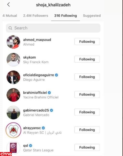 همچنین خلیل زاده در صفحه اینستاگرام صفحه رسمی باشگاه الریان، رئیس باشگاه قطری، سرمربی تیم و همبازی های جدیدش را فالو کرده است.