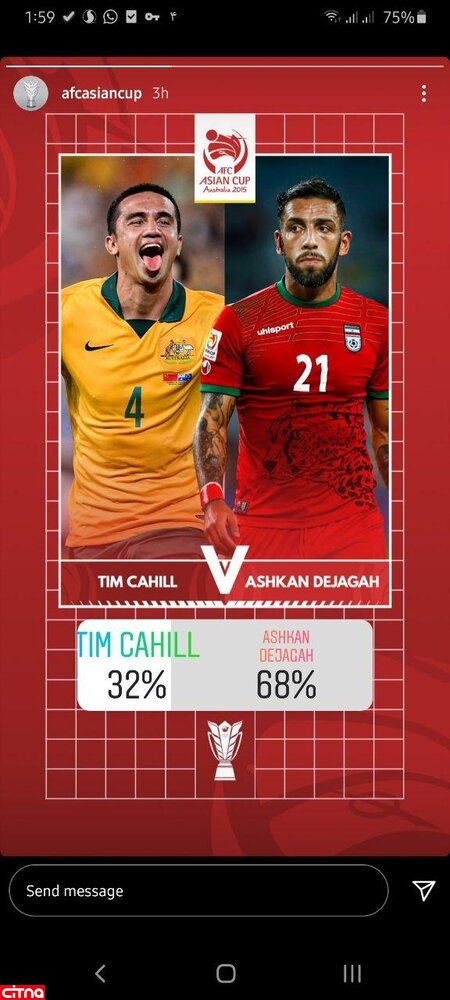 به گزارش سرویس وبگردی سیتنا، صفحه رسمی رقابت های جام ملت های آسیا در اینستاگرام، با برگزاری یک نظرسنجی به دنبال انتخاب محبوب ترین بازیکن جام ملت های آسیا در سال 2015 است. در یکی از این نظرسنجی ها، در حال حاضر اشکان دژاگه ستاره تیم ملی فوتبال ایران در آن مسابقات و تیم کهیل، بازیکن سرشناس تیم ملی استرالیا با یکدیگر مشغول رقابت هستند که فعلا دژاگه با اختلافی معنادار از رقیب استرالیایی خود پیش است.
