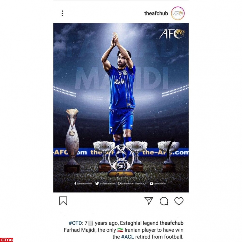 به گزارش سرویس وبگردی سیتنا، صفحه رسمی اینستاگرامی کنفدراسیون فوتبال آسیا پستی در خصوص شماره 7 و سرمربی سابق استقلال منتشر کرد. AFC در این پست عکسی از فرهاد مجیدی به همراه جام های کسب شده این بازیکن قرار داد.