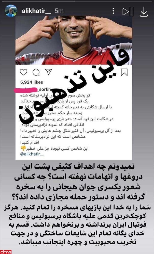 به گزارش سرویس وبگردی سیتنا، علی خطیر معاون ورزشی سابق باشگاه استقلال با انتشار یک استوری نسبت به صحبت هایی که در خصوص دخالت او در محرومیت آل کثیر گفته می شود، واکنش نشان داد.