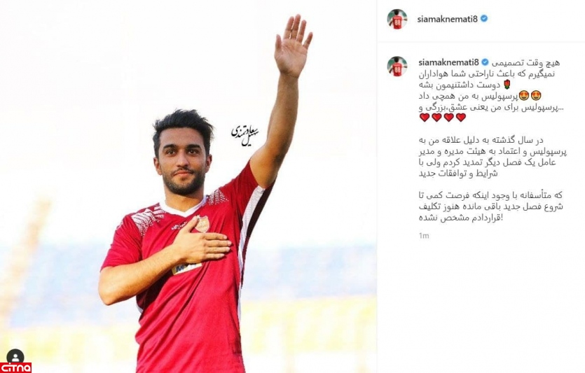 به گزارش سرویس وبگردی سیتنا، دیشب بود که شایعه انتقال سیامک نعمتی وینگر پرسپولیس به استقلال در فضای مجازی منتشر شد و حواشی زیادی به همراه داشت. نعمتی در اینستاگرامش به این شایعه واکنش نشان داد و نوشت: