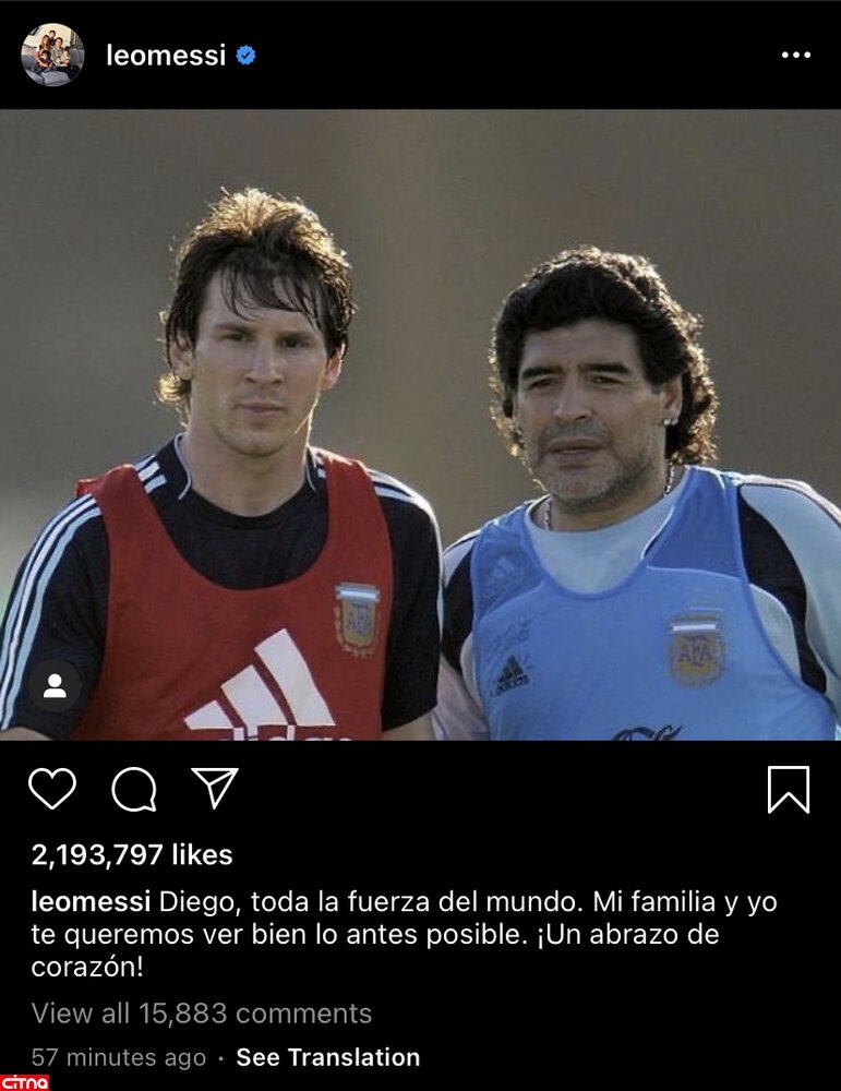 بسیاری از ستاره های بزرگ و چهره های مشهور دنیای فوتبال در این مدت پیام هایی روحیه بخش برای مارادونا ارسال کرده اند که لیونل مسی نیز از این قاعده مستثنی نبوده است. کاپیتان تیم ملی آرژانتین یک دهه قبل شاگرد مارادونا در تیم ملی بود و به نظر می رسید رابطه خوبی بین این دو فوق ستاره محبوب البی سلسته برقرار است. حالا لیونل مسی با انتشار تصویری از خود در کنار مارادونا، برای او آرزوی سلامتی کرده است.