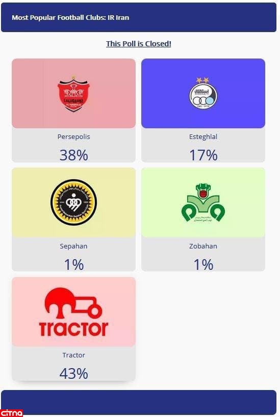 این نظرسنجی به پایان رسید و باشگاه تراکتور تبریز با کسب ۴۳ درصد آراء پرهوادارترین باشگاه ایرانی با آراء کاربران AFC شناخته شد. پرسپولیس با کسب ۳۸ درصد آراء در رده دوم ایستاد و استقلال با کسب ۱۷ درصد آراء در جایگاه سوم قرار گرفت. سپاهان و ذوب آهن هر کدام در این نظرسنجی یک درصد آراء را از آن خود کردند.