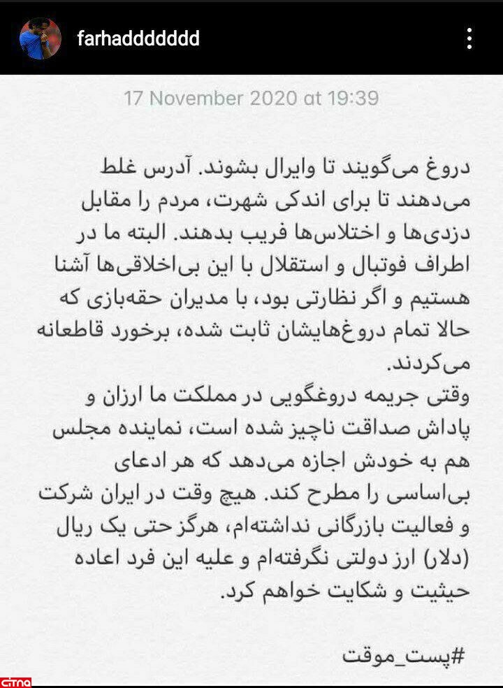 واکنش اینستاگرامی فرهاد مجیدی به ادعای نماینده مجلس: دروغ میگویند تا مردم را مقابل اختلاسها فریب بدهند
