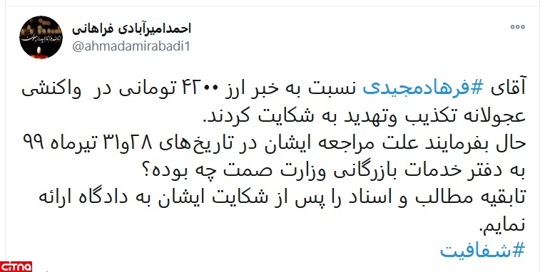 آقای #فرهادمجیدی نسبت به خبر ارز ۴۲۰۰ تومانی در واکنشی عجولانه تکذیب وتهدید به شکایت کردند.