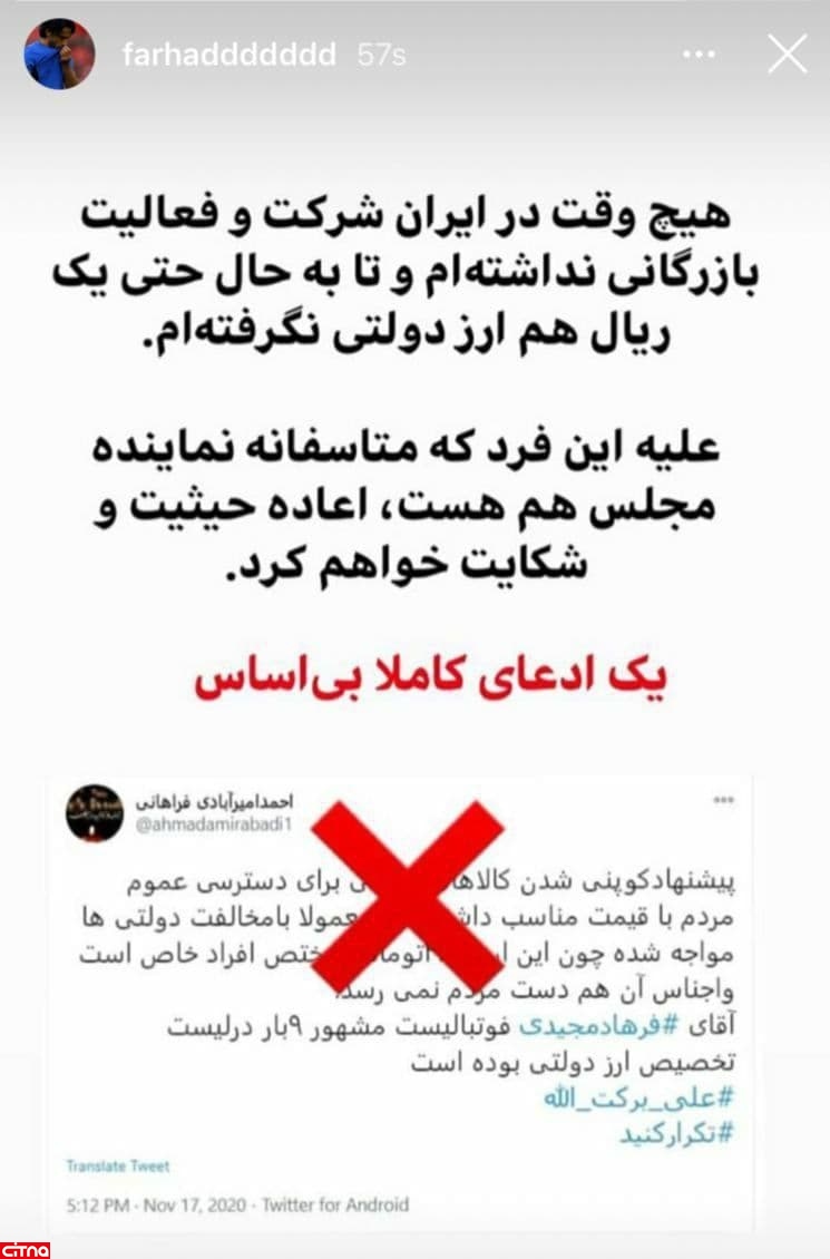 در همین حال، «احمد امیرآبادی فراهانی» روز چهارشنبه و در جمع خبرنگاران درباره توییت روز گذشته خود مبنی بر دریافت 9 بار ارز دولتی از سوی فرهاد مجیدی کاپیتان و سرمربی سابق استقلال و رد آن توسط مجیدی، گفت: یک ماه پیش یکی از وارد کنندگان غله کشور گزارشی مبنی بر اینکه یکی از بازیکنان سابق فوتبال در حال گرفتن ارز دولتی برای شرکتهایی است که به نام خود او نیست به من ارائه کرد.