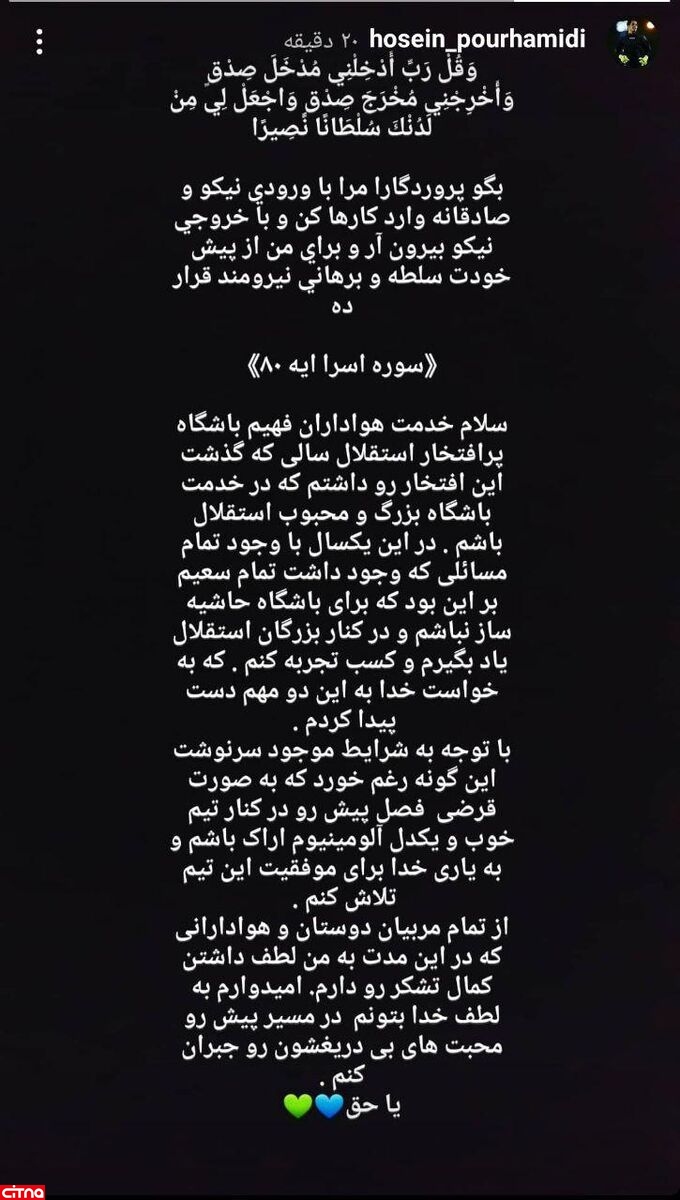 به گزارش سرویس وبگردی سیتنا، حسین پورحمیدی، دروازه بان جوان استقلال از هواداران استقلال خداحافظی کرد و از مقصدش که تیم آلومینیم اراک است خبر داد. او استوری زیر را در اینستاگرامش منتشر کرد: