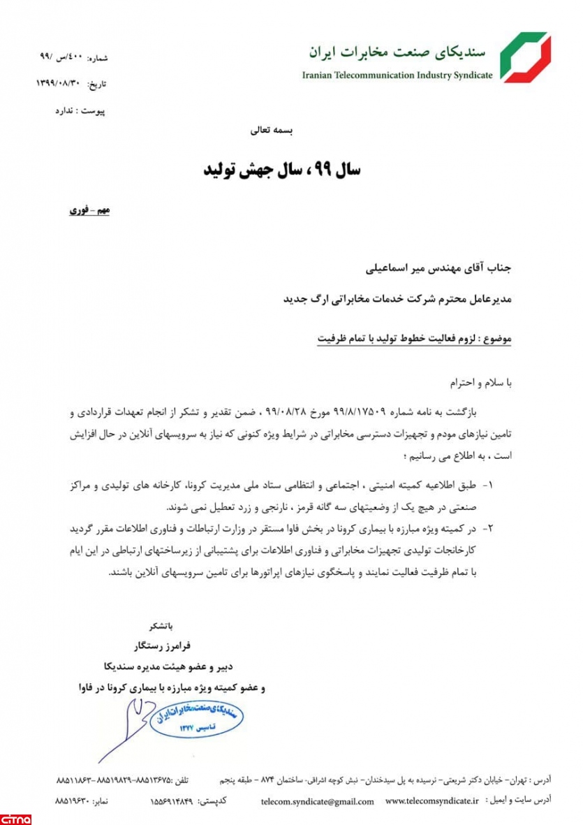اعلام آماده باش به کارخانجات و کارگاههای تولیدی مخابراتی و شرکتهای خدمات فنی مهندسی پشتیبان در ایام محدودیت کرونایی
