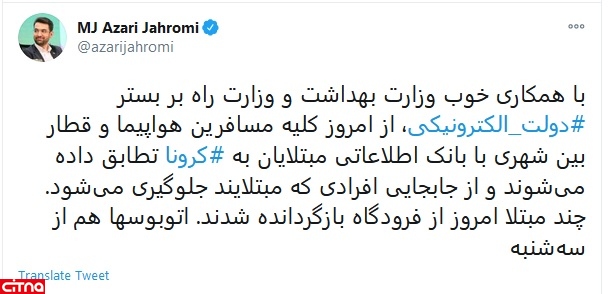 با همکاری خوب وزارت بهداشت و وزارت راه بر بستر #دولت_الکترونیکی، از امروز کلیه مسافرین هواپیما و قطار بین شهری با بانک اطلاعاتی مبتلایان به #کرونا تطابق داده میشوند و از جابجایی افرادی که مبتلایند جلوگیری میشود. چند مبتلا امروز از فرودگاه بازگردانده شدند. اتوبوسها هم از سهشنبه
