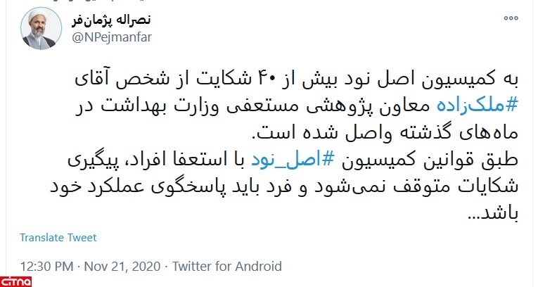 به کمیسیون اصل نود بیش از ۴۰ شکایت از شخص آقای #ملکزاده معاون پژوهشی مستعفی وزارت بهداشت در ماههای گذشته واصل شده است.