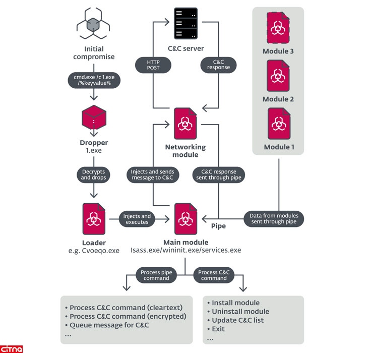 نوع فعالیت ModPipe به گونهای تشکیل شده است که ابتدا نصب و یک فایل راهانداز فعال میشود، سپس ماژول اصلی بدافزار که با برقراری ارتباط با سایر ماژولها و فرمان و کنترل آنها در سرور و شبکه فعال میشود.