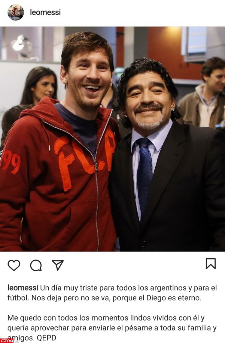 به گزارش سرویس وبگردی سیتنا، لیونل مسی به درگذشت مارادونا واکنش نشان داد و در پستی اینستاگرام نوشت: