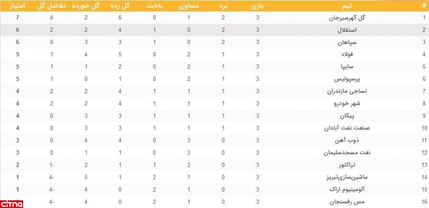 جدول لیگ برتر فوتبال در پایان هفته سوم/ صعود سپاهان به رده ۳، تراکتور در جایگاه ۱۳