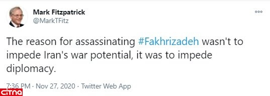 مارک فیتزپاتریک با انتشار توئیتی به ترور دانشمند هسته ای کشورمان محسن فخری زاده واکنش نشان داد.