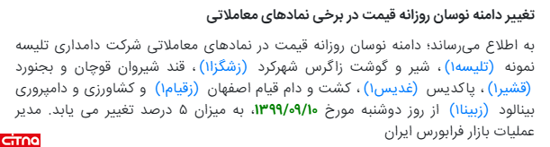 دامنه نوسان روزانه قیمت در نمادهای معاملاتی تلیسه، زشگزا، قشیر، غدیس، زقیام و زبینا از روز دوشنبه مورخ 1399/09/10، به میزان 5 درصد تغییر مییابد.