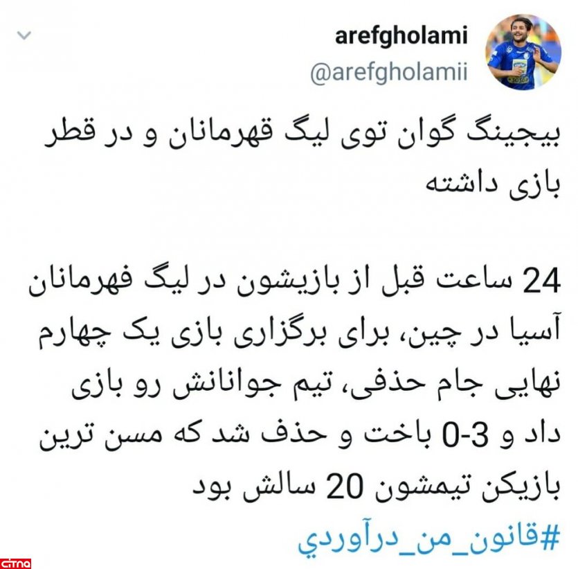 به گزارش سرویس وبگردی سیتنا، لغو بازی پرسپولیس برابر نساجی و احتمال برگزار نشدن بازی دیگر این تیم به خاطر حضور در فینال لیگ قهرمانان آسیا واکنش های موافقان و مخالفان را به همراه داشت. در جدیدترین اظهارنظر مخالفان عارف غلامی مدافع استقلال با مثال زدن تیم چینی به رقیب خود کنایه زد.