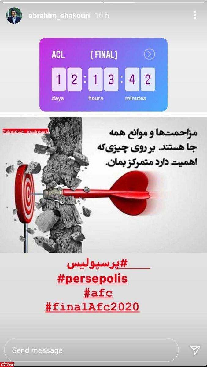 به گزارش سرویس وبگردی سیتنا، ابراهیم شکوری با انتشار تصویری در صفحه شخصی اینستاگرامش روزشمار دیدار پرسپولیس برای حضور در فینال آسیا را به راه انداخت. معاون اجرایی باشگاه پرسپولیس همچنین متنی معنادار را هم در این استوری قرار داده که در آن چنین نوشته شده: