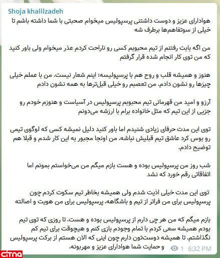 به گزارش سرویس وبگردی سیتنا، شجاع خلیل زاده مدافع سابقه پرسپولیس که ابتدای فصل از این تیم جدا و راهی الریان قطر شد، در کانال تلگرامی خود پستی را برای هواداران این تیم منتشر کرد.