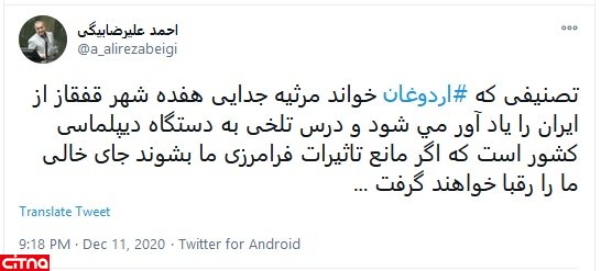 به گزارش سرویس وبگردی سیتنا، احمد علیرضا بیگی، نمایندهی اصولگرای مردم تبریز در مجلس در توئیتی نوشت: تصنیفی که اردوغان خواند مرثیه جدایى هفده شهر قفقاز از ایران را یاد آور می شود و درس تلخى به دستگاه دیپلماسی کشور است که اگر مانع تاثیرات فرامرزى ما بشوند جاى خالى ما را رقبا خواهند گرفت ...
