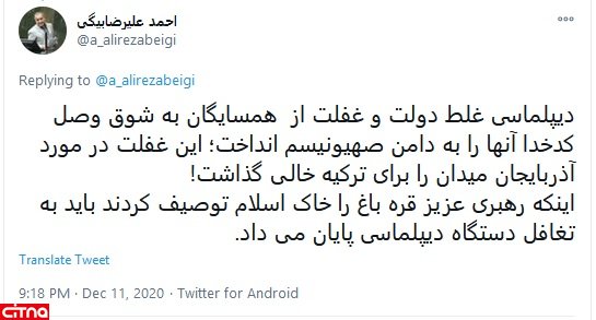 احمد علیرضا بیگی در ادامه نوشت: اینکه رهبرى عزیز قره باغ را خاک اسلام توصیف کردند باید به تغافل دستگاه دیپلماسی پایان می داد.