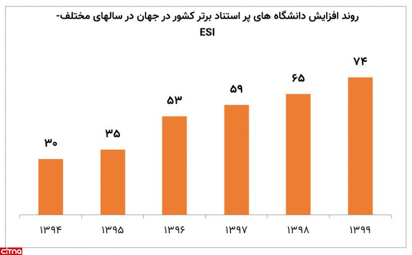 سرپرست ISC یادآور شد: مایه مباهات است که در آخرین بهروزرسانی انجامشده در آذر ۹۹ تعداد ۷۴ دانشگاه و مؤسسه تحقیقاتی از کشور جمهوری اسلامی ایران در میان یک درصد دانشگاههای برتر جهان که دارای بیشترین میزان اثرگذاری بودهاند، مشاهده میشود. بنابراین در مقایسه با سال قبل که تعداد ۶۵ مورد بود، تعداد دانشگاهها و مراکز تحقیقاتی یک درصد برتر ایران ۱۴ درصد افزایش و نسبت به سال ۹۴ بیش از ۱۴۷ درصد افزایش یافته است.