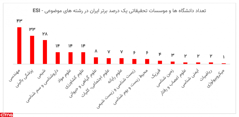 وی ادامه داد: از لحاظ تعداد بیشترین دانشگاهها و مؤسسات تحقیقاتی ایران در حوزه مهندسی رتبهبندی شدهاند. تعداد آنها در این حوزه ۴۳ مورد است. ۳۳ دانشگاه و مؤسسه تحقیقاتی ایران در پزشکی بالینی جزء ۱% برتر پراستناد دنیا هستند. در حوزه شیمی ۲۸ دانشگاه و مؤسسه تحقیقاتی در زمره مؤثرترینهای دنیا قرار گرفتهاند. بعد از آن ایران در حوزههای داروشناسی و سمشناسی، علوم مواد، علوم کشاورزی هر کدام ۱۴ دانشگاه و مؤسسه در بین ۱% برترها دارد. حوزههای علوم گیاهی و حیوانی، علوم اجتماعی، کلیات، علوم رایانه، زیستشناسی و زیستشیمی، محیطزیست و بومشناسی در جایگاههای بعدی از لحاظ تعداد قرار میگیرند. ایران در این حوزهها بین ۶ تا ۸ مؤسسه و دانشگاه دارد. حوزههای فیزیک، زمینشناسی، علوم اعصاب و رفتار، ایمنیشناسی، ریاضیات و میکروبیولوژی در مرتبههای بعدی قرار میگیرند. تعداد مؤسسات برتر ایران در این حوزهها بین ۱ تا ۴ مورد است.