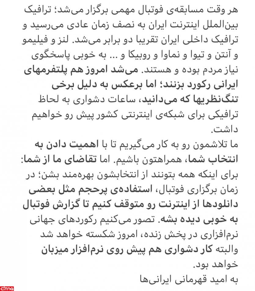 وی همچنین توصیه کرد: در زمان پخش فوتبال، از استفاده پرحجم از اینترنت مثل بعضی دانلودها خودداری کنید تا دیگران هم بتوانند گزارش فوتبالی را ببینند.