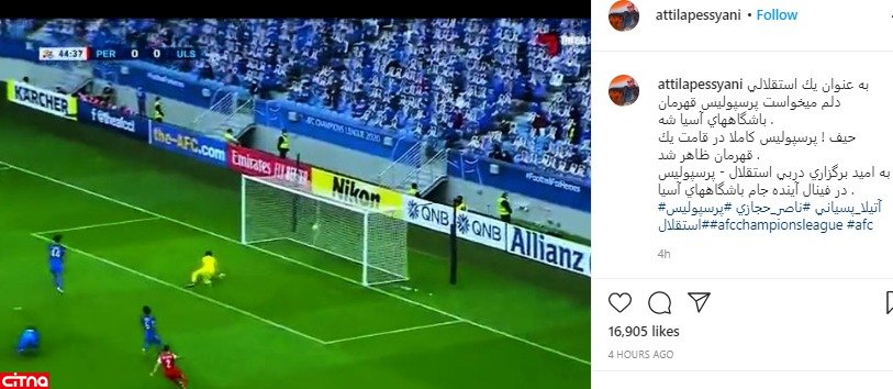 به گزارش سرویس وبگردی سیتنا، بعد از باخت پرسپولیس در فینال آسیا آتیلا پسیانی در صفحه اینستاگرام خود نوشت: من به عنوان یک استقلالی دوست داشتم پرسپولیس قهرمان آسیا شود اما بهرحال این اتفاق رخ نداد. امیدوارم روزی برسد که پرسپولیس و استقلال فینال لیگ قهرمانان آسیا را مقابل یکدیگر برگزار کنند.