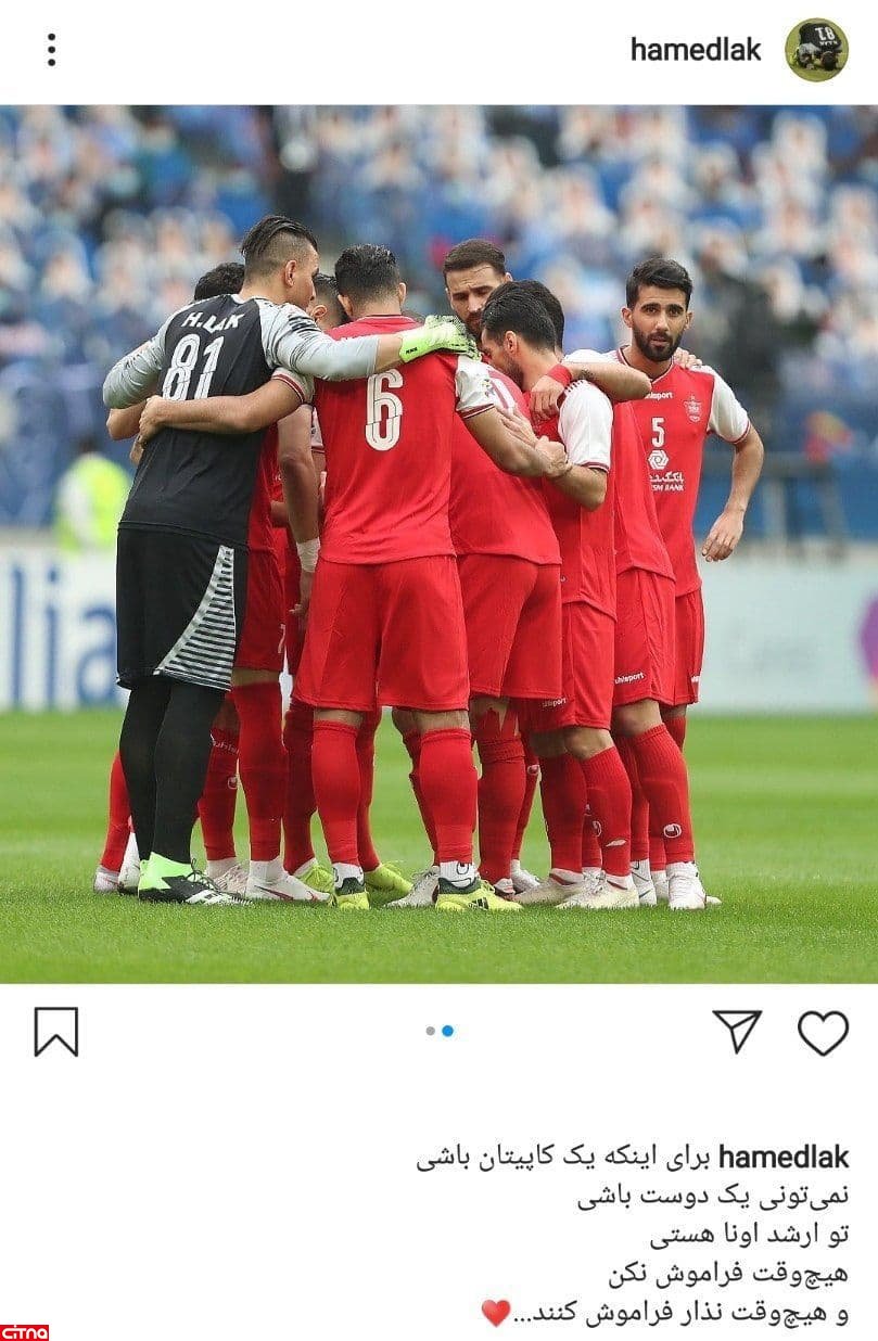 به گزارش سرویس وبگردی سیتنا، حامد لک، سنگربان پرسپولیس پس از تساوی تیمش در قائمشهر برابر نساجی در دیدار معوقه هفته پنجم لیگ برتر ایران در صفحه اینستاگرامش نوشت: