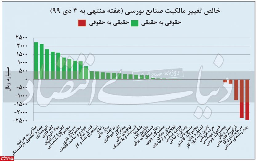 در هفتهای که گذشت بیشترین خالص فروش حقیقیها در زیرمجموعههای گروه شرکتهای چندرشتهای صنعتی رقم خورد. این صنعت با محوریت «شستا» شاهد انتقال سهامی به ارزش ۲۴۲ میلیارد و ۹۳۰ میلیون تومان در مسیر حقیقی به حقوقی بود. دومین گروه که با بیشترین فشار فروش از سوی سرمایهگذاران خرد بورسی مواجه شد سرمایهگذاری بود. این گروه در هفتهای که گذشت شاهد جابهجایی سهامی به ارزش ۲۳۰ میلیارد و ۸۰۰ میلیون تومان در مسیر حقیقی به حقوقی بود. فرآوردههای نفتی نیز در هفته مورد بررسی در مجموع شاهد جابهجایی سهامی به ارزش ۱۲۴ میلیارد و ۴۶۰ میلیون تومان از سبد سهام سهامداران خرد به پرتفوی حقوقیها بود. از دیگر گروههایی که سهامداران خرد به آنها پشت کردند میتوان به حمل و نقل، محصولات چرمی، فنی و مهندسی، خردهفروشی و تامین آب و برق و گاز و انتشار و چاپ اشاره کرد.