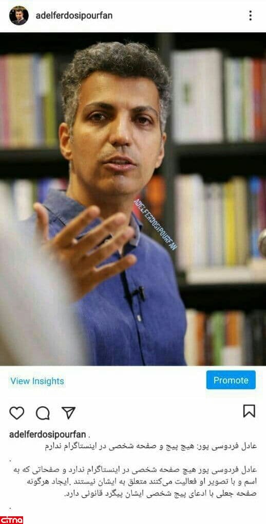 به گزارش سرویس وبگردی سیتنا، عادل فردوسی پور، گزارشگر سابق شبکه سه که به تازگی، فینال لیگ قهرمانان آسیا را در صفحه فارسی اینستاگرام گزارش کرد، اعلام کرده است که هیچ صفحه شخصی ای در اینستاگرام ندارد.