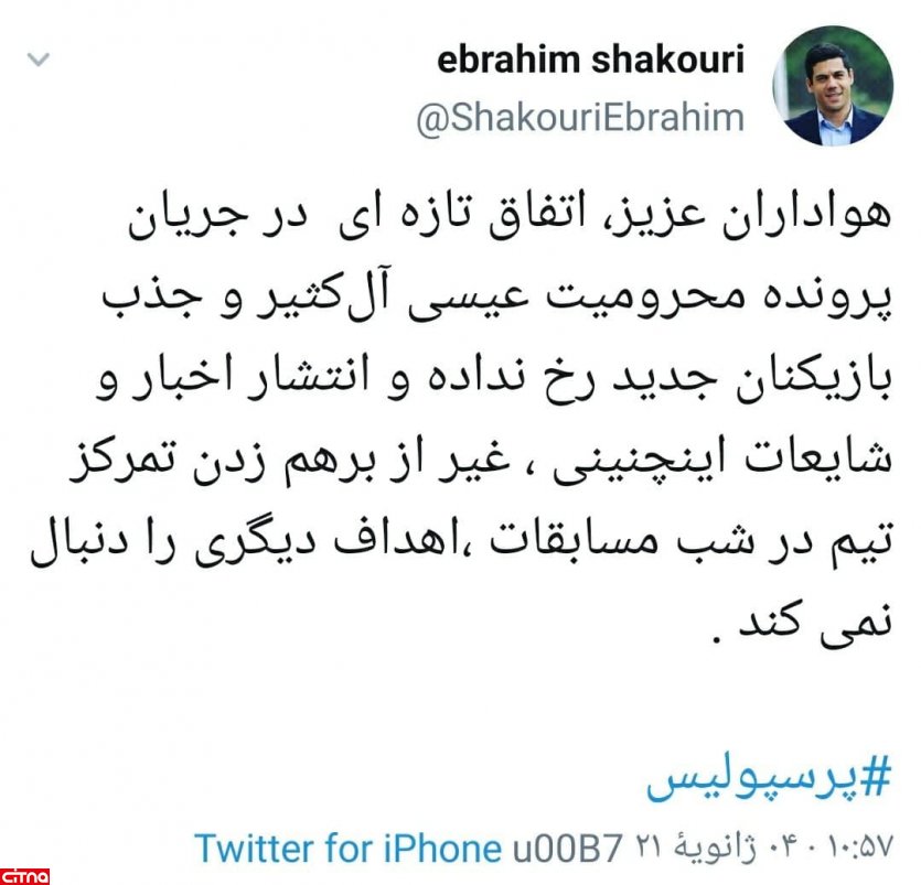توییت ابراهیم شکوری درباره بخشش آلکثیر و خرید جدید پرسپولیس