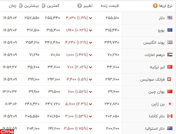به گزارش ایران پژواک، هر دلار آمریکا در صرافی های رسمی به قیمت ۲۵ هزار و ۵۵۱تومان و هر یورو ۳۱ هزار و ۵۴۴ تومان فروخته می شود.