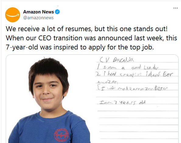 در توییت آمازون نوشته شده است از زمانی که جف بزوس گفته میخواهد از سمت خود کنارهگیری کند، این شرکت رزومههای زیادی دریافت کرده، اما این یکی خیلی قابل توجه است.