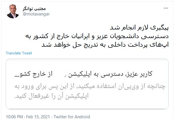 به گزارش سیتنا، مجتبی توانگر، نماینده مردم تهران در مجلس شورای اسلامی پیرامون موضوع دسترسی ایرانیان خارج از کشور به اپهای پرداخت داخلی، توئیت کرد: