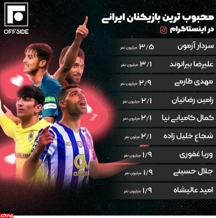 آزمون با 3.5 میلیون دنبال کننده در صدر این فهرست قرار دارد و بعد از او علیرضا بیرانوند است که 3.1 نفر صفحه او را در اینستاگرام دنبال می کنند.