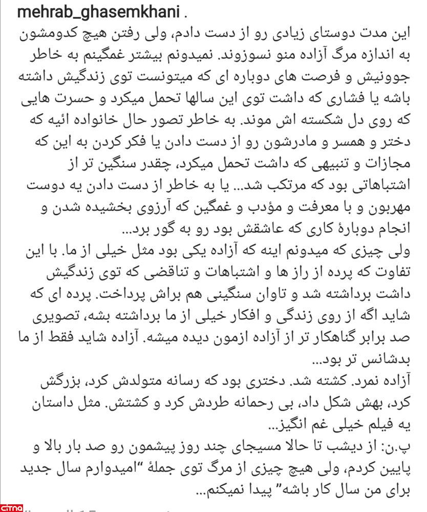 اینستاپست مهراب قاسمخانی؛ آزاده نمرد، کشته شد!