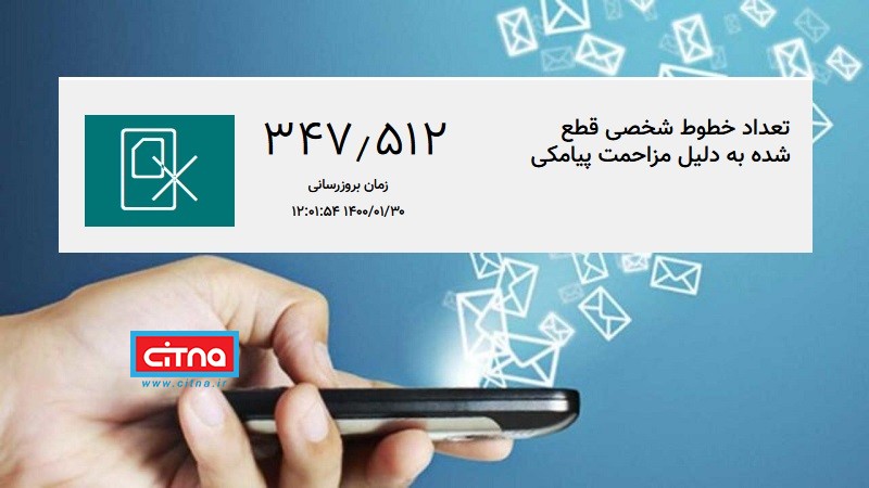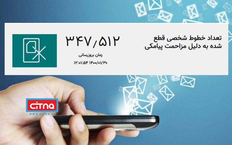 بر این اساس، سازمان تنظیم مقررات و ارتباطات رادیویی از زمان مسدود کردن پیامک‌های مزاحم، تعداد خطوط شخصی قطع‌شده به دلیل مزاحمت پیامکی را اعلام می‌کند که طبق این آمار، تعداد خطوط شخصی قطع‌شده به دلیل مزاحمت پیامکی تا تاریخ 30 فروردین ماه 1400، حاکی از مسدود شدن 347 هزار و 512 خط شخصی توسط رگولاتوری است.