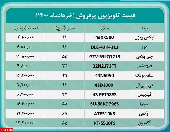 در این میان، تلویزیون ۴۹ اینچ سامسونگ مدل ۴۹N۶۹۵۰ با قیمت ۱۶ میلیون و ۴۰۰ هزار تومان فروخته میشود. تلویزیون سونیا ۵۸ اینچ مدل SU-۵۸KD۷۹۶۵ نیز در بازار با قیمت ۱۶ میلیون و ۶۰۰ هزار تومان دیده میشود.