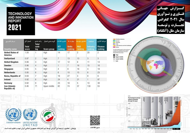 به گزارش سیتنا به نقل از ایرنا، گزارش جهانی فناوری و نوآوری ۲۰۲۱ توسط کنفرانس توسعه و تجارت سازمان ملل متحد با همکاری نمایندگان هر کشور از دانشگاهها، سازمانهای معتبر جهانی و سازمانهای زیر مجموعه سازمان ملل متحد جمعآوری شده است.