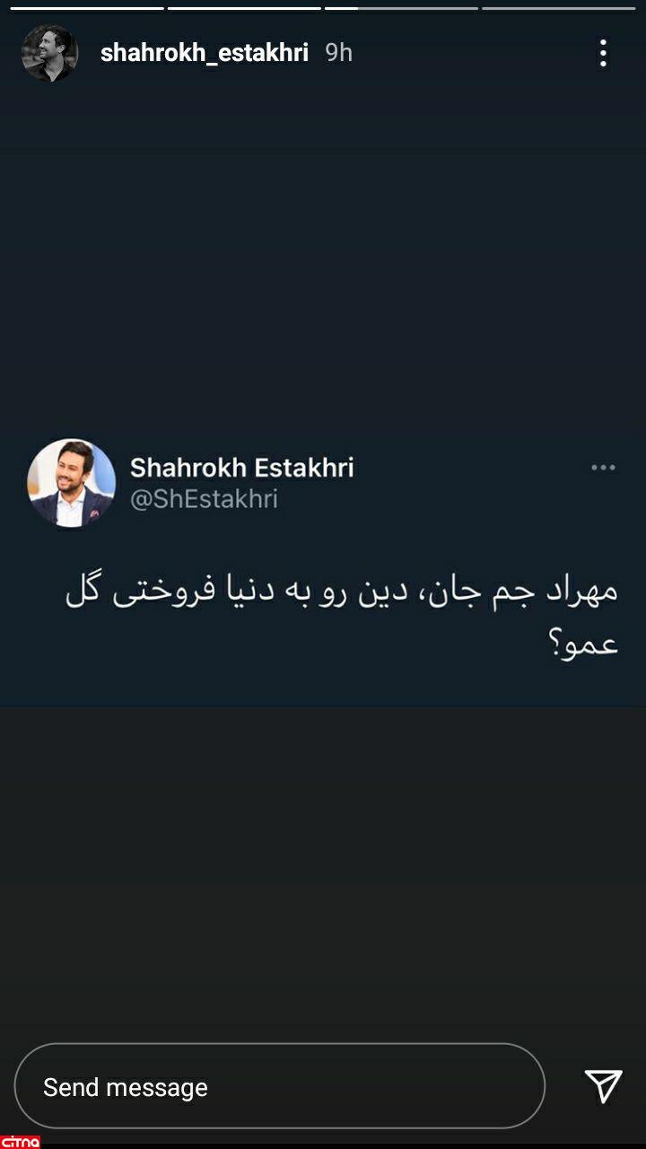 شاهرخ استخری در استوری خود نوشت: مهراد جم جان، دین رو به دنیا فروختی گل عمو.