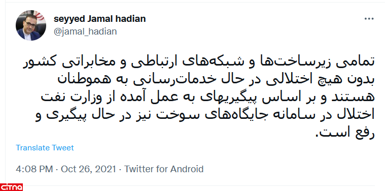 به گزارش خبرنگار سیتنا، سید جمال هادیان، رییس مرکز روابط عمومی و اطلاع رسانی وزارت ارتباطات و فناوری اطلاعات، توئیت کرد: تمامی زیرساختها و شبکههای ارتباطی و مخابراتی کشور بدون هیچ اختلالی در حال خدماترسانی به هموطنان هستند و بر اساس پیگیریهای به عمل آمده از وزارت نفت اختلال در سامانه جایگاههای سوخت نیز در حال پیگیری و رفع است.