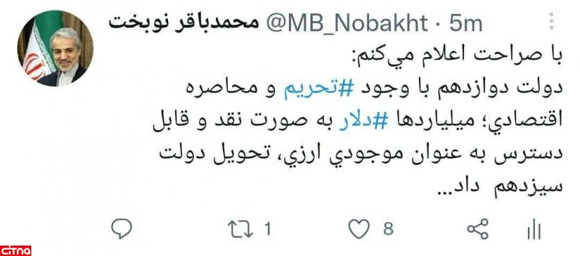 به گزارش سرویس وبگردی سیتنا، محمدباقر نوبخت، رئیس سابق برنامه و بودجه در توئیتی در واکنش به ادعای یک رسانه اصولگرا درباره خالی بودن خزانه، باهشتگ های تحریم و دلار نوشت: