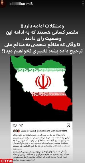 استوری علی کریمی در اعتراض به مشکلات تیم ملی ایران