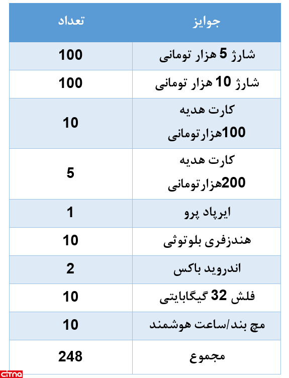 جوایز کمپین همراه با تعداد به شرح جدول زیر است: