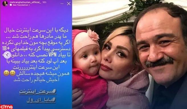مهران غفوریان بازیگر طنز سینما و تلویزیون که مدتی پیش با تلاش و همت خود وزنش را پایین آورد و پس از آن نیز از یک حمله قلبی پشت سر گذاشت، حالا با کنایهای، به موضوع کندی سرعت اینترنت اشاره کرده است. وی با انتشار متنی در فضای مجازی گفت: "دیگر با این سرعت اینترنت خیال ما پدر مادرها راحت شد. اگر یه موقع بچههایمان خدایی نکرده دسترسی پیدا میکرد به فیلمهای ۱۸+ تا بیاد وی پی آن نصب کنه دانلود کنه بعد آپلود کنه و بعد بیاد آن را ببیند با این سرعت اینترنت همون ۱۸ سالش میشود. آخیش خیالم راحت شد."