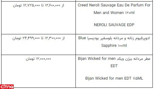 بر اساس این لیست عطر مردانه بیژن ویکد Bijan Wicked for men EDT Bijan Wicked for men EDT ۷۵ML نیز به قیمت ۱۲ میلیون تومان و ادوپرفیوم زنانه و مردانه بلوسفیر بودیسیا Blue Sapphire ۱۰۰ml به نرخ ۱۲ میلیون و ۳۰۰ هزار تومان تا ۲۴ میلیون و ۴۹۹ هزار تومان فروخته میشوند.